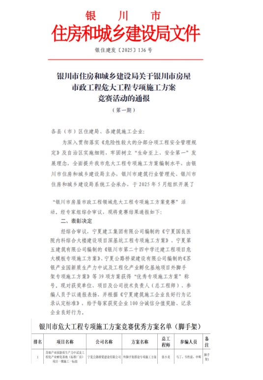 6月5日,銀川市住房和城鄉(xiāng)建設局發(fā)布《關于銀川市房屋市政工程危大工程專項施工方案競賽活動的通報》(銀住建發(fā)〔2025〕136號),其中,蘇銀產(chǎn)業(yè)園新質生產(chǎn)力中試及工程化產(chǎn)業(yè)孵化基地項目編制的《蘇銀產(chǎn)業(yè)園新質生產(chǎn)力中試及工程化產(chǎn)業(yè)孵化基地項目外腳手架專項施工方案》(以下簡稱“方案”)獲評“優(yōu)秀專項施工方案”,并獲得企業(yè)100分誠信分值獎勵、記錄企業(yè)良好行為。